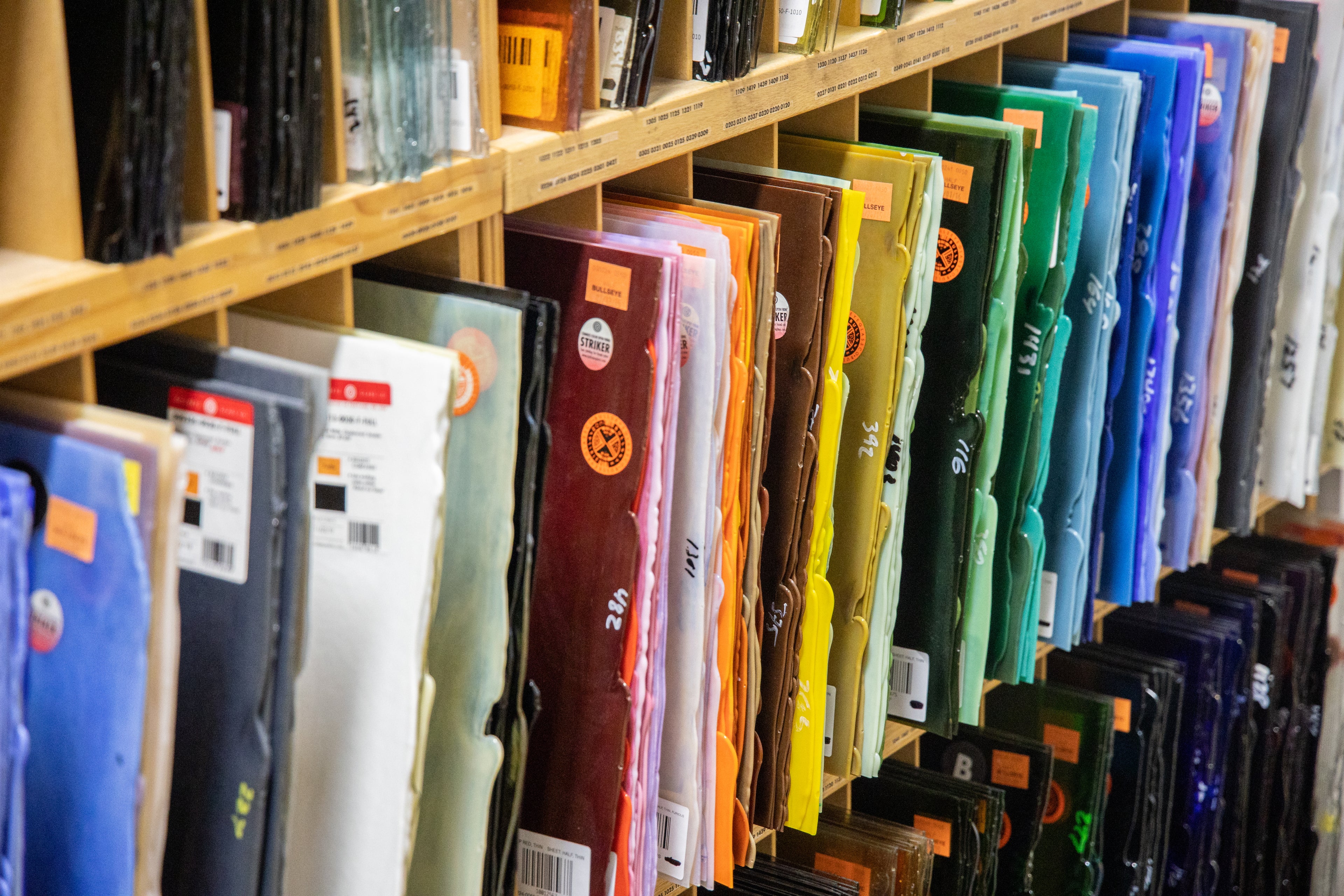 Get all the Bullseye Glass materials you need at Brazee! Email your order ahead of time and pick it up in person to save on shipping. Want to browse our stock? Email or call us to set up a private shopping time, Thursdays + Saturdays. Follow us on social media to find out about our Glass Sales!